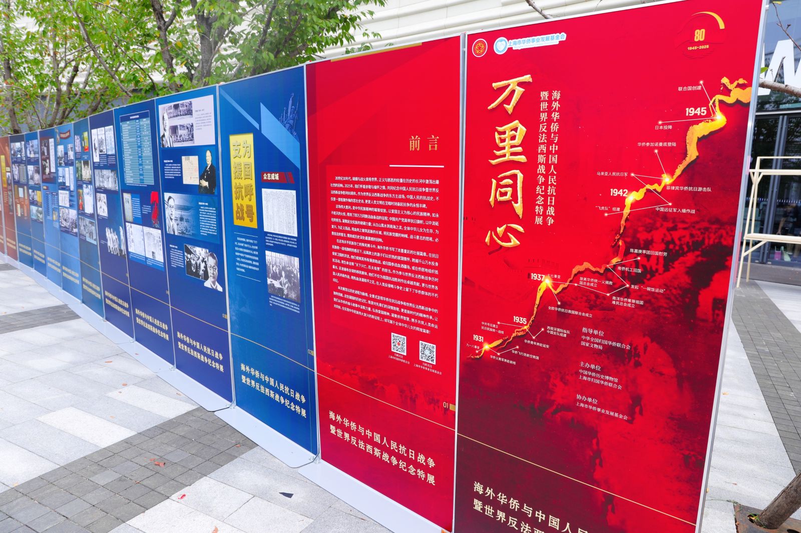 步行终点,西岸大剧院外广场的《海外华侨与中国人民抗日战争暨世界反法西斯战争纪念特展》举行。展览由中国侨联、国家文物局指导,中国华侨历史博物馆、上海市侨联主办,上海市华侨事业发展基金会协办。四大主题“为国呼号 支援抗战”“烽火侨心 共赴国难”“同仇敌忾 共卫和平”“欢庆胜利 铭记历史”,与刚结束的纪念中国人民抗日战争暨世界反法西斯战争胜利80周年阅兵式相呼应,激励侨界铭记历史、缅怀先烈,珍爱和平、开创未来。
