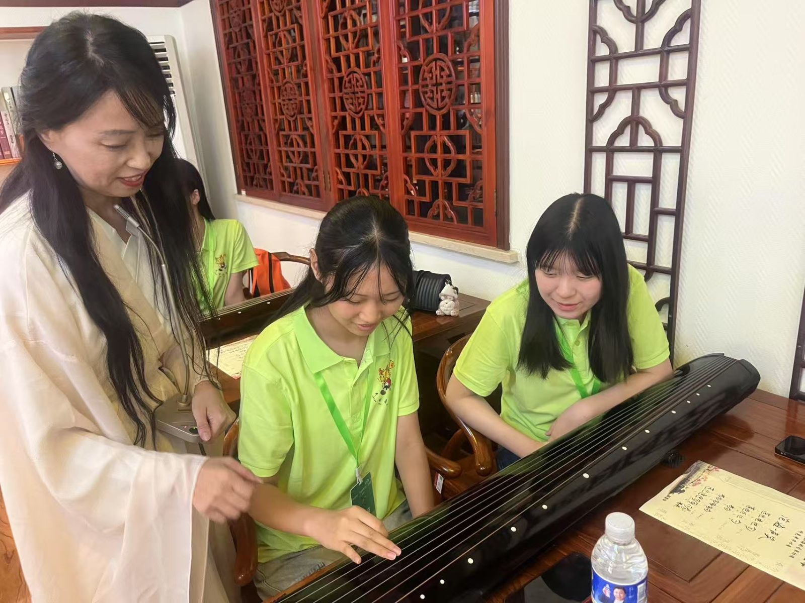 “独坐幽篁里,弹琴复长啸。”古琴以其音淡、声稀,琴意得之于弦外,深受文人喜爱,列为“四艺”(琴棋书画)之首。7月22日,夏令营主办方为营员们安排了第一堂国学课。在“认识古琴”环节,营员们亲手触摸琴身上的十三个徽位,并了解“天圆地方”的琴体构造所蕴含的哲学思想。在授课老师的指导下,营员们从最基础的“散音”开始练习。虽然初学难免生涩,当《沧海一声笑》的旋律在教室内此起彼伏响起时,大家的成就感满满。