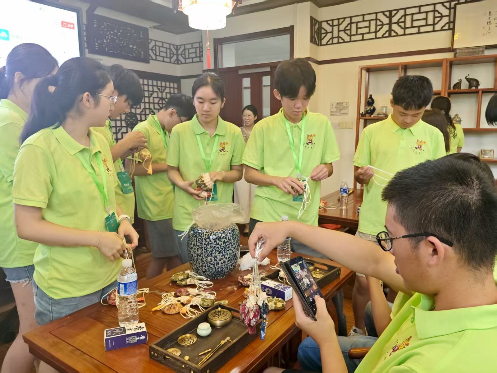 “岁聿云莫,采萧穫菽”。古人以香养性、以香会友,从《诗经》中灸草到《红楼梦》里的百合香,香文化可以说贯穿了整个中华文明史。制香课上,营员们在老师的指导下,选用艾草、薰衣草等具有驱蚊安神功效的药材,一针一线缝制香囊。这些精心制作的香薰作品将随营员们远渡重洋,成为中华文化在海外传播的“特殊使者”。