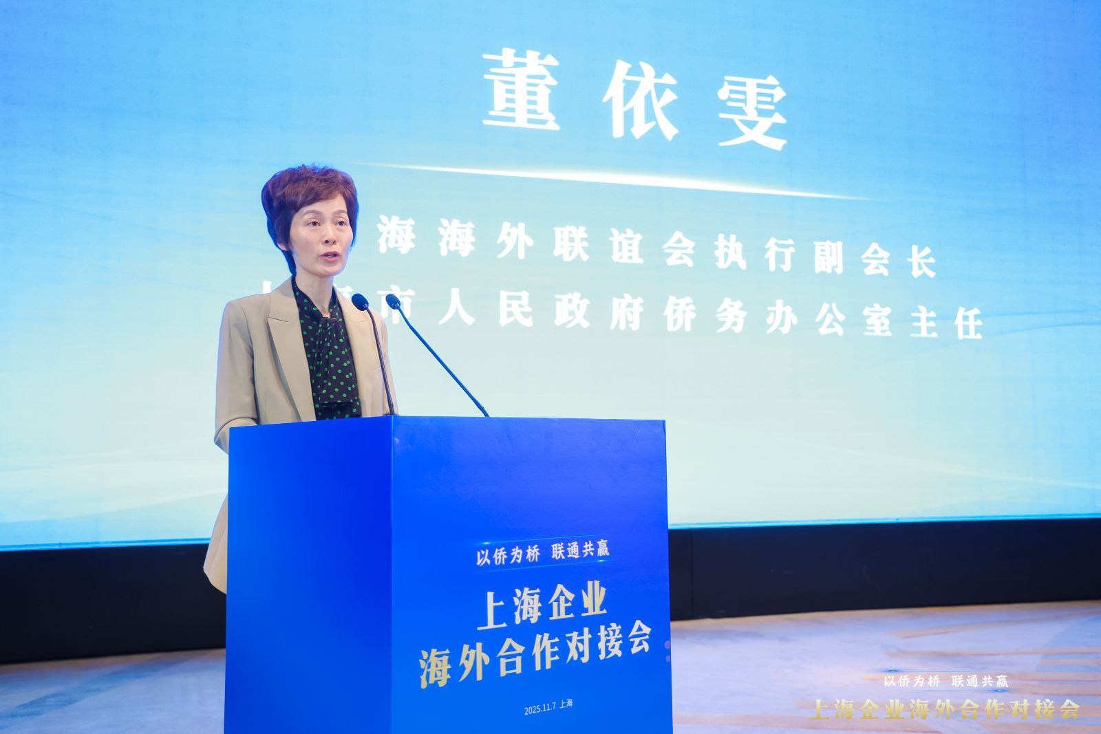 上海海外联谊会执行副会长、市政府侨办主任董依雯在致辞中代表主办方对海内外嘉宾的到来表示热烈欢迎。她表示,中共二十届四中全会对中国未来5年发展作出顶层设计和战略擘画,提出稳步扩大制度型开放,与世界各国共享机遇、共同发展;上海作为中国改革开放的前沿阵地,广大侨胞是促进高质量“引进来”和高水平“走出去”的重要力量。她期待对接会助力企业更好汇入全球化浪潮,推动出海模式从“走出去”向“走进去”提升;助力构建共享共赢新生态,加快形成和合共生的开放生态;助力上海加快建设“五个中心”,将住在国先进技术、管理经验和市场资源引入中国、引进上海,为上海加快建成具有世界影响力的社会主义现代化国际大都市作出新的更大贡献。