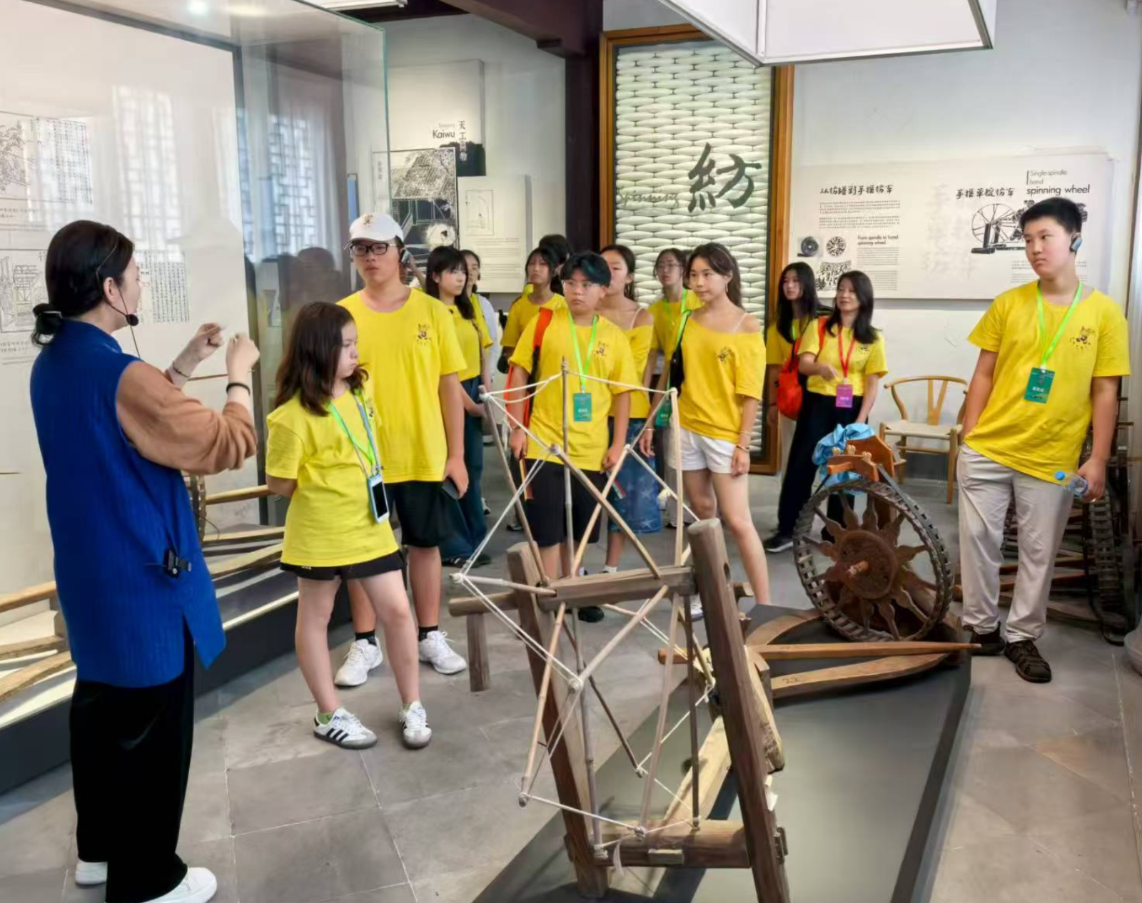 “一梭穿行宇宙,两手织就云裳”。走进展厅,一架架古旧的纺纱机、织布机,一件件印着花纹的布匹、衣物,让营员们仿佛穿越千年历史,回到了“户户纺纱、家家织布”的宋元时期。
