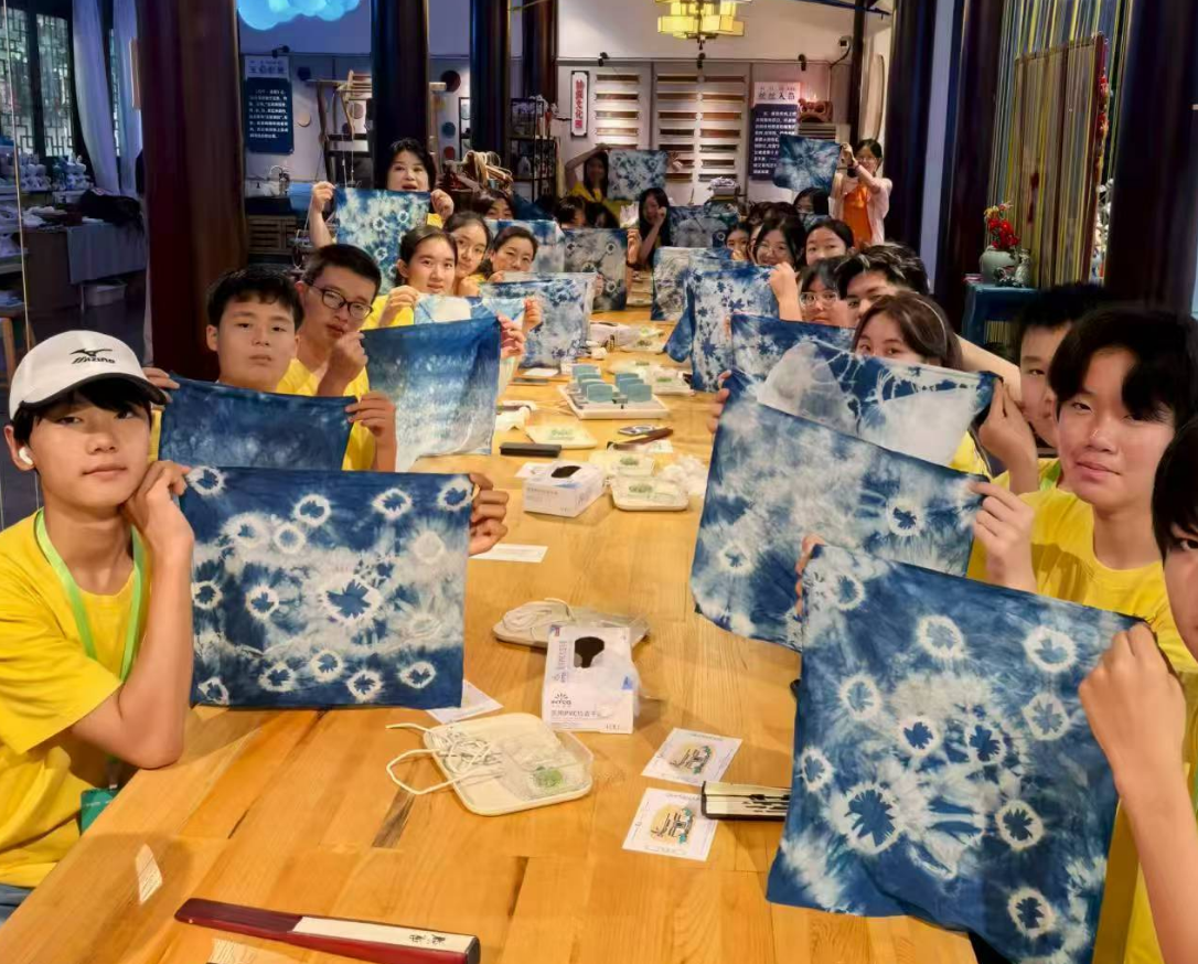 布料折叠、捆扎、浸染、固色、清洗……在“非遗”师傅们的带领下,营员们在现场动手制作属于自己的扎染作品。当一块块素白的棉布经过染色、拆线和洗涤后,呈现出独一无二的蓝白花纹时,营员们纷纷惊喜地展示自己的成果。“扎染太神奇了!不同的捆扎方式能创造出完全不同的图案,这比机器印染更有趣!” 来自日本的营员王北辰兴奋地说。