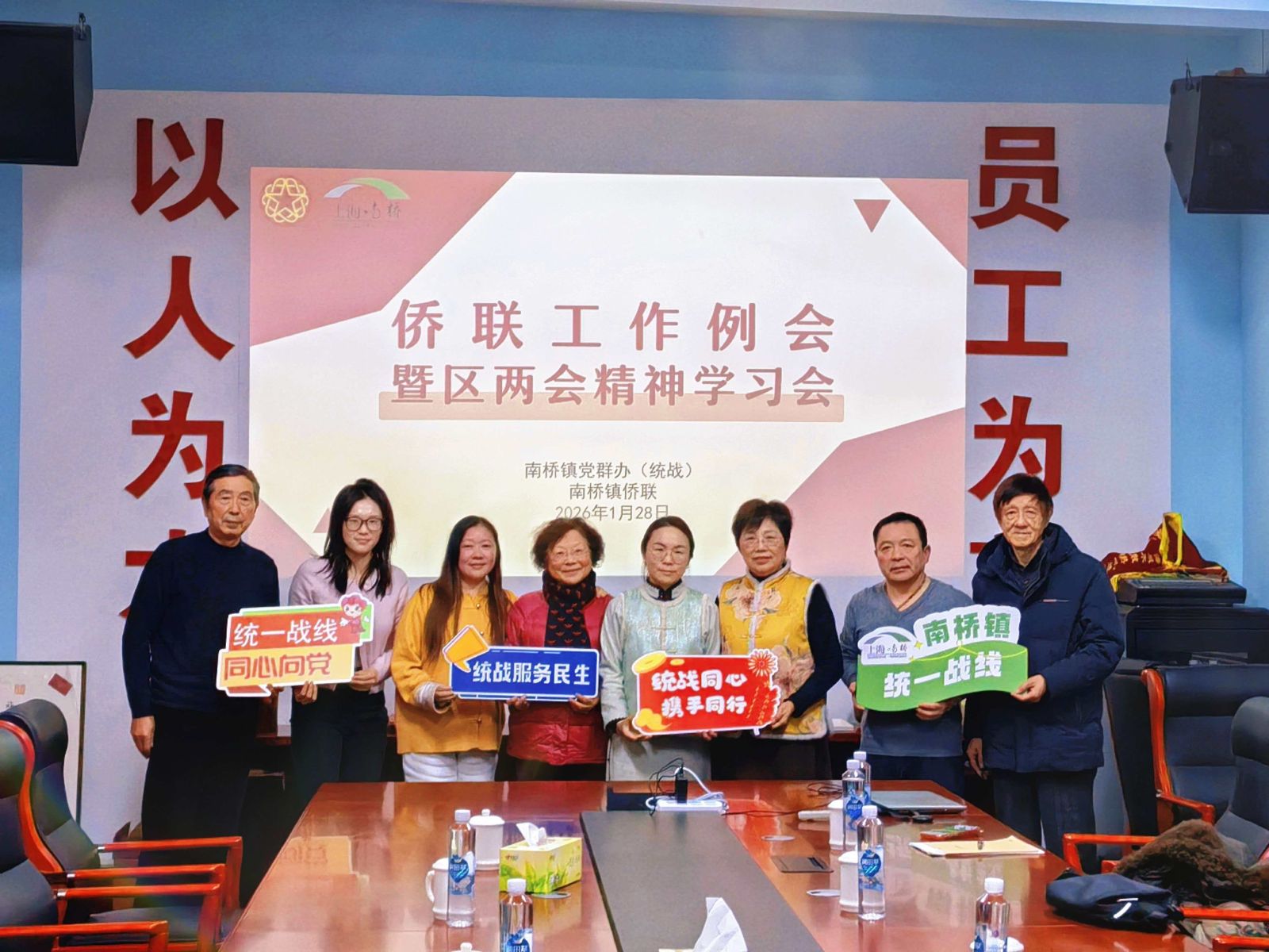 1月28日,南桥镇召开侨联工作例会暨区两会精神学习会,镇党委委员毛爱洁、镇侨联主席李凤英出席会议。会上传达学习了区两会会议精神,系统回顾了2025年侨联工作开展情况,并围绕服务中心大局、深化为侨服务等领域商议2026年侨联重点工作任务,为扎实推动侨联工作高质量发展奠定坚实基础。