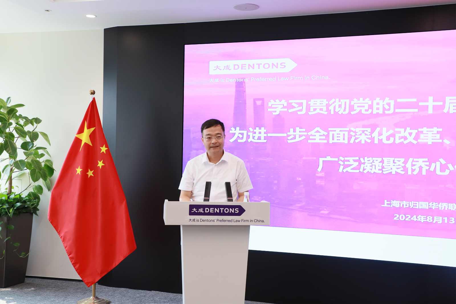 8月13日上午,“法治保障,推进中国式现代化”——党的二十届三中全会精神学习交流会在位于陆家嘴环球金融中心的北京大成(上海)律师事务所举行。本次交流会由上海市侨联指导,浦东新区侨联和中共北京大成(上海)律师事务所党委联合主办,北京大成(上海)律师事务所侨联承办。