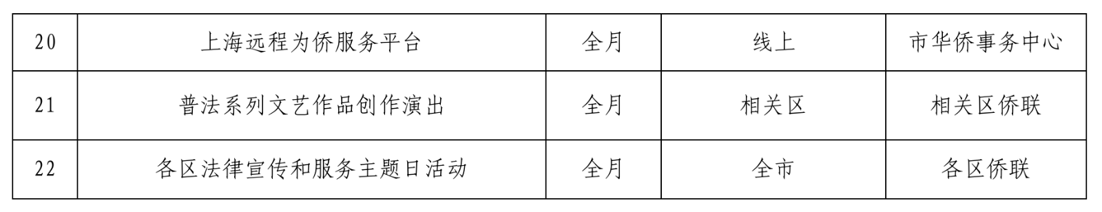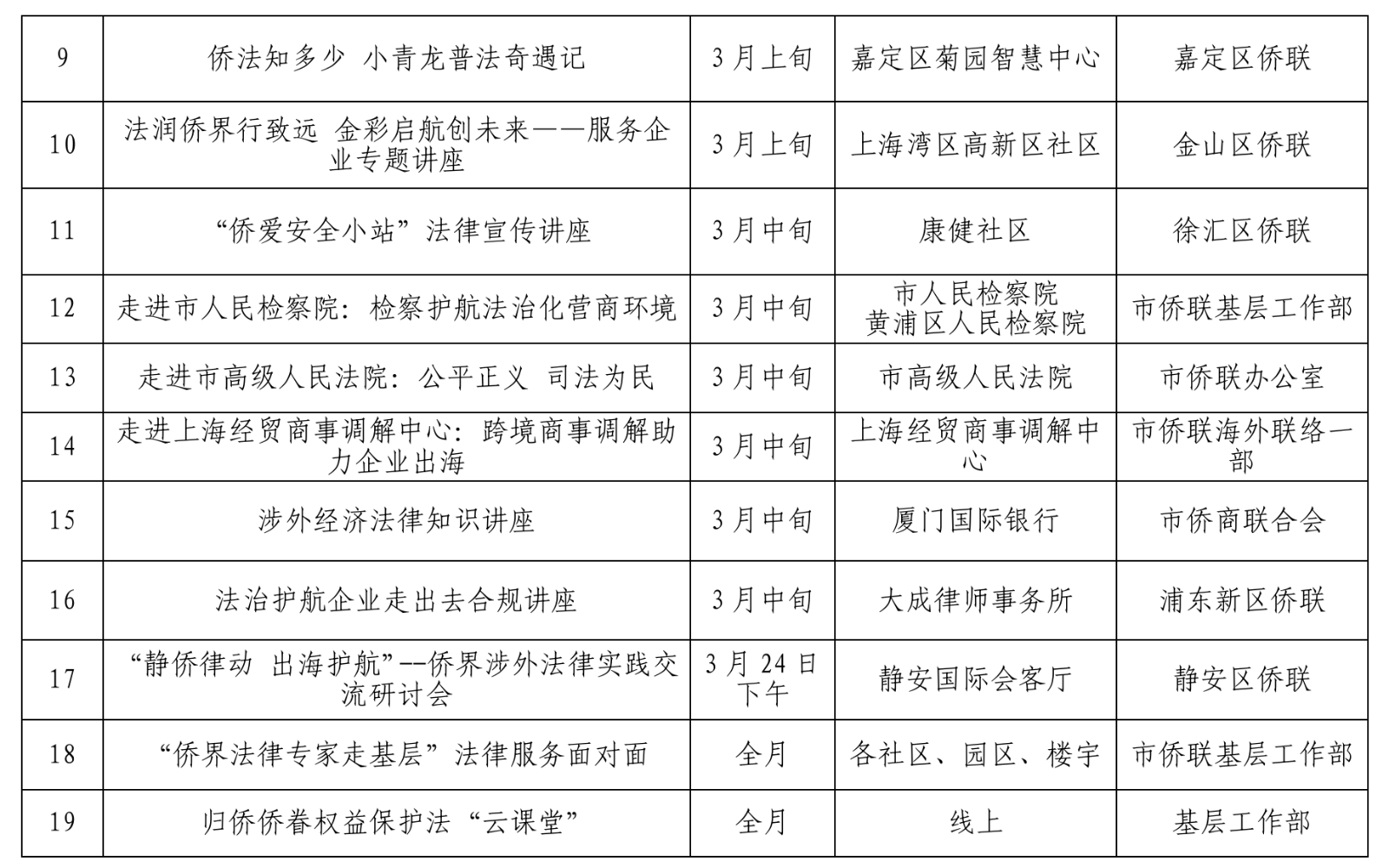 本次宣传月期间,全市各级侨办、侨联将联合各相关单位,充分发挥协同联动机制优势,举办专题报告、法规宣讲、专家走基层、新媒体宣传等活动,做好服务实效案例汇集,依法维护侨界权益、优化营商环境,为建设更高水平法治上海,为上海加快建成具有世界影响力的社会主义现代化大都市凝聚侨界法治共识和智慧力量。