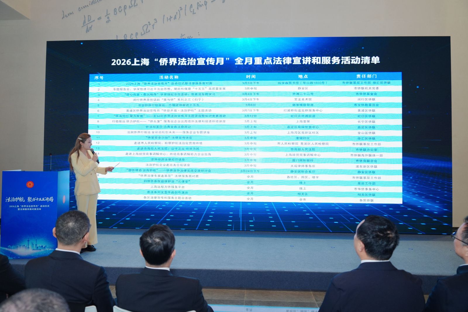 活动现场发布了2026上海 “侨界法治宣传月”全市重点活动清单,清单涵盖走进司法机关、专题报告会、侨界法律专家走基层、线上云课堂、各区特色主题活动等20多项重点内容,体现线上线下联动,市、区、基层协同,形式多样,内容丰富。活动中还为“大徐家汇国际商贸法律服务圈”揭牌。