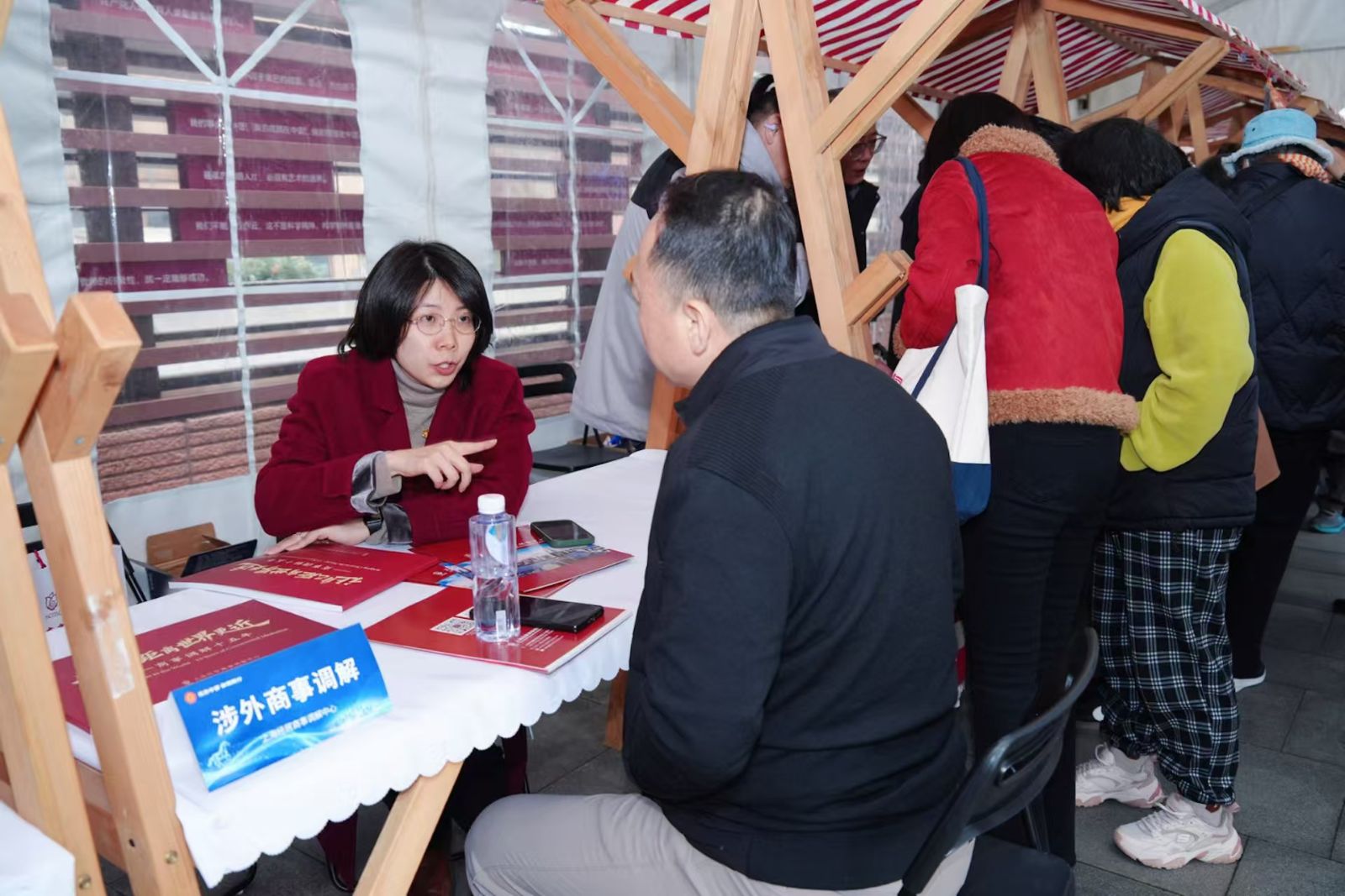 启动仪式会场外开设公益法律服务集市, 2026上海企业海外合作联盟法律服务专家团成员、市华侨事务中心及各区相关涉侨单位为到场侨商侨企和侨界群众提供政策法律咨询、商事调解、人才政策解读、“出海问诊” 等一对一面对面服务。
